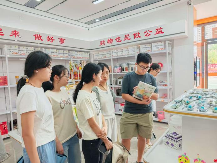 基于前期调研,7月9日,实践队前往廉江市爱心商店,考察其运作管理模式与特色产品品类。该店涵盖高校团队设计文创、爱心捐赠手工艺品及廉江本土文创产品。队员们结合考察成果,现场研讨手造纸文创设计方向。