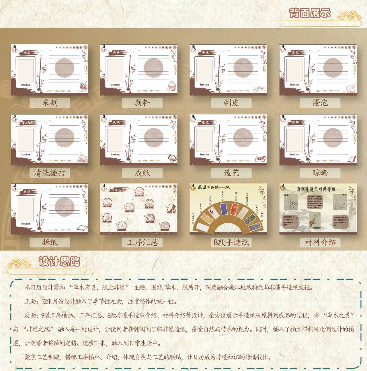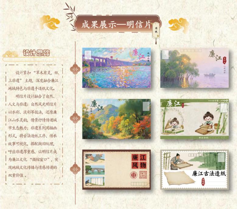 实践队设计出日历、明信片、信封三款文创产品。产品紧扣“草木有灵,纸上非遗”主题,围绕草木与纸展开创作,深度融合廉江地域特色与非遗手造纸文化。