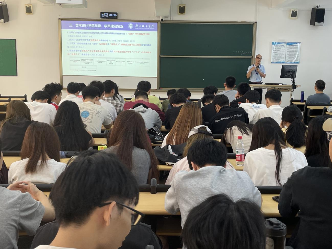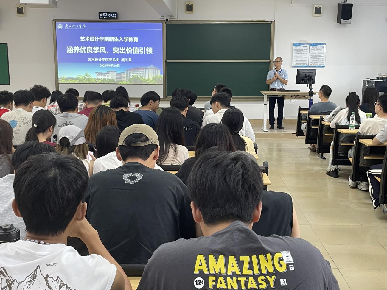 在 “涵养优良学风” 板块,颜书记结合艺术设计专业的学习特点,从三个方面提出要求。一是要树立 “勤学善思” 的学习态度。艺术设计离不开扎实的理论基础与丰富的实践积累,同学们需认真对待每一门课程,主动钻研专业知识,积极参与课堂讨论与课题研究,不断提升自身的专业素养与创新思维。二是要培养 “求真务实” 的学习习惯。他以学院优秀毕业生的案例为例,强调艺术创作需脚踏实地,从生活中汲取灵感,杜绝抄袭、敷衍等不良学习行为,以严谨的态度对待每一次设计作品。三是要营造 “互助共进” 的学习氛围。鼓励新生们组建学习小组,分享学习心得与设计经验,在交流合作中共同进步,形成比学赶超的良好学风。