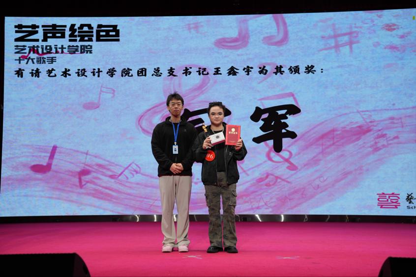 艺术设计学院团总支书记王鑫宇老师为冠军选手周道亮颁奖。