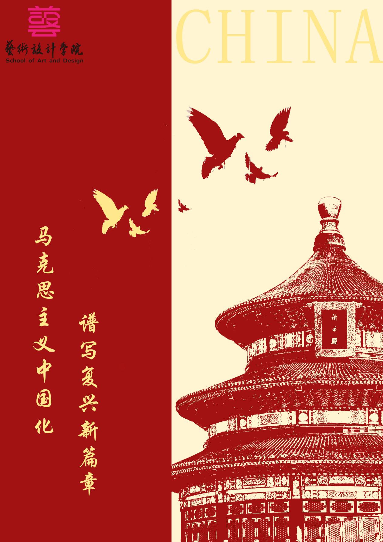设计理念:海报以红金主色调聚焦“马克思主义中国化”主题,左侧书法点题配金色和平鸽,右侧天坛融传统文化,红色和平鸽与“CHINA”呼应复兴愿景,以艺术语言融合理论与时代意象。