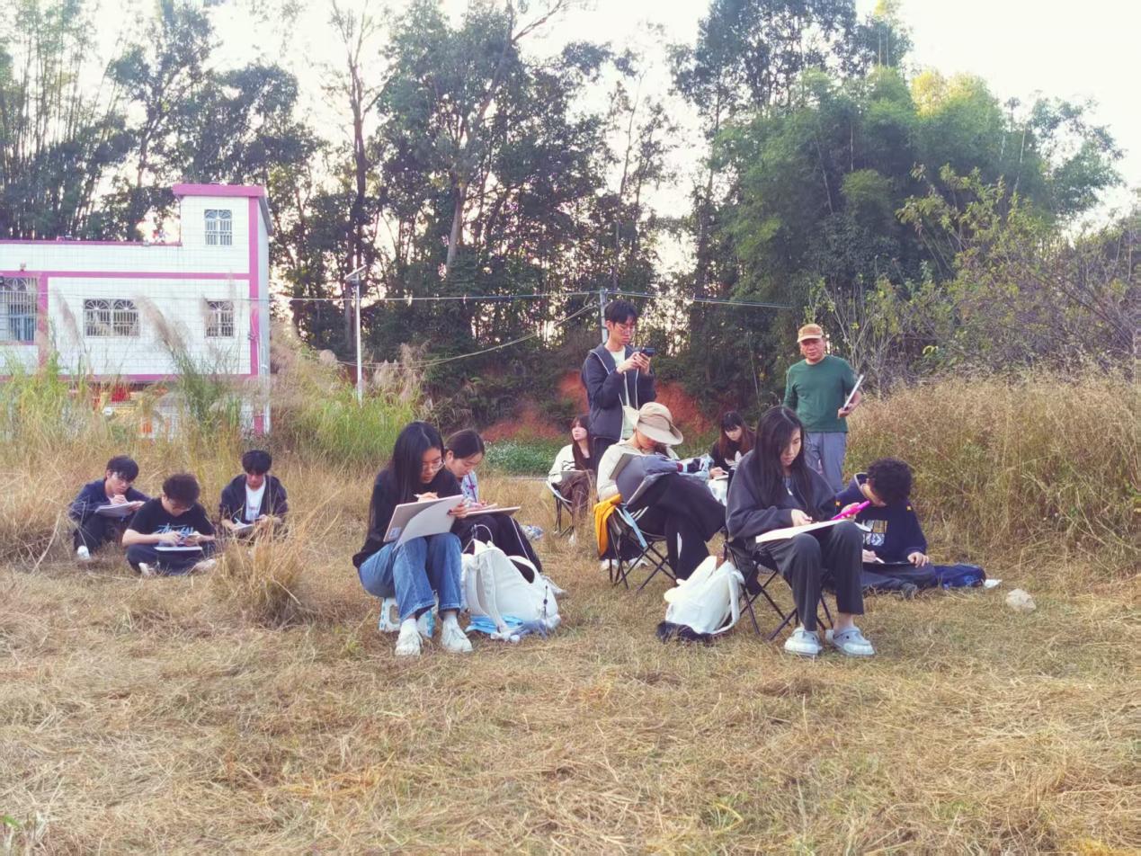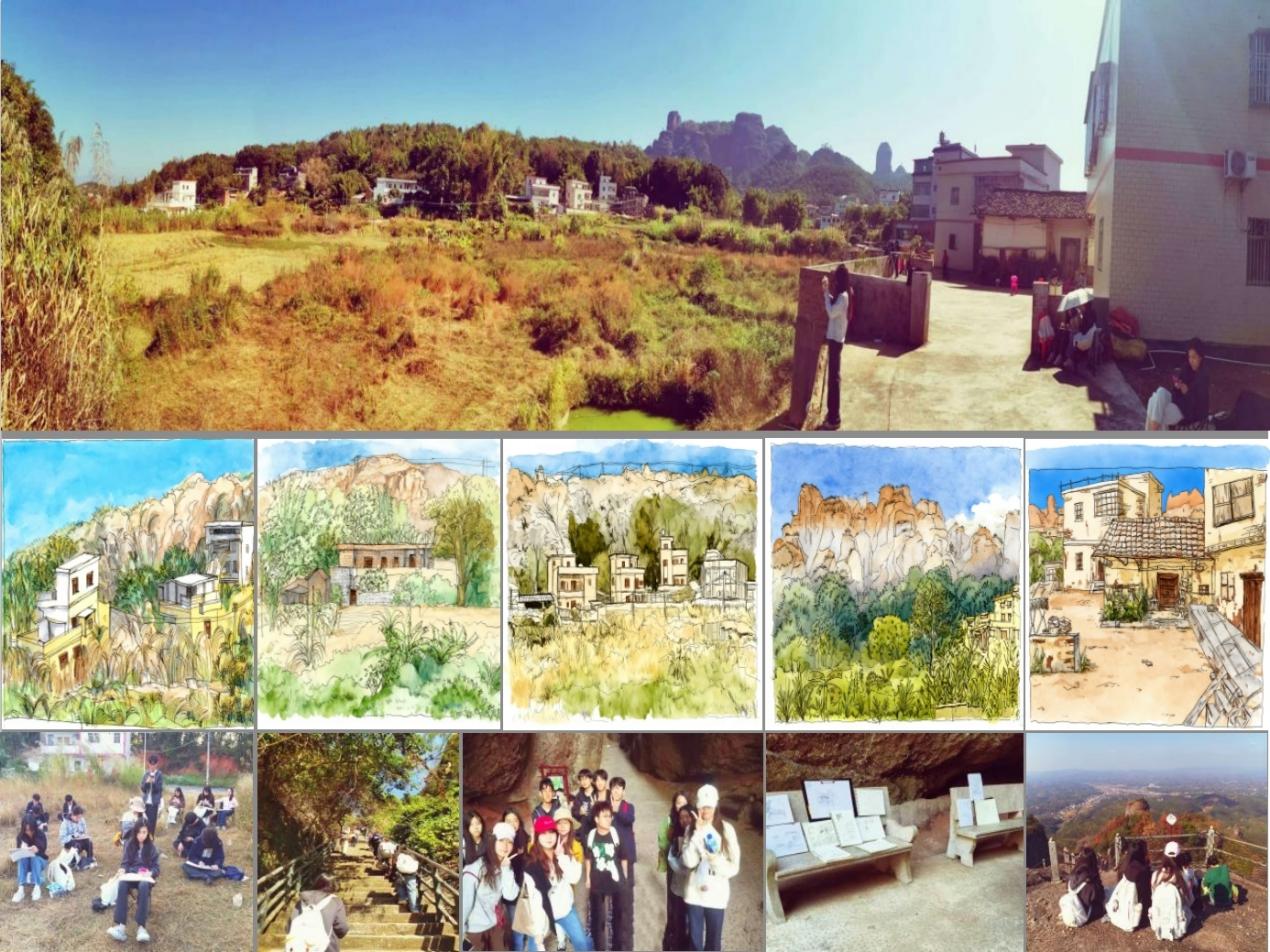 近日,广州理工学院艺术设计学院 24 环境1班采风创作课程圆满落幕。在环境设计系主任安陆禄统筹协调、学院全方位支持下,建筑学高级工程师邹善智老师带领15名同学赴河源龙川霍山旅游景区,以丹霞地貌风光为创作核心,开启“钢笔手绘 + AI 淡彩”人机共创艺术实践,实现自然风光与数字技术的深度融合。