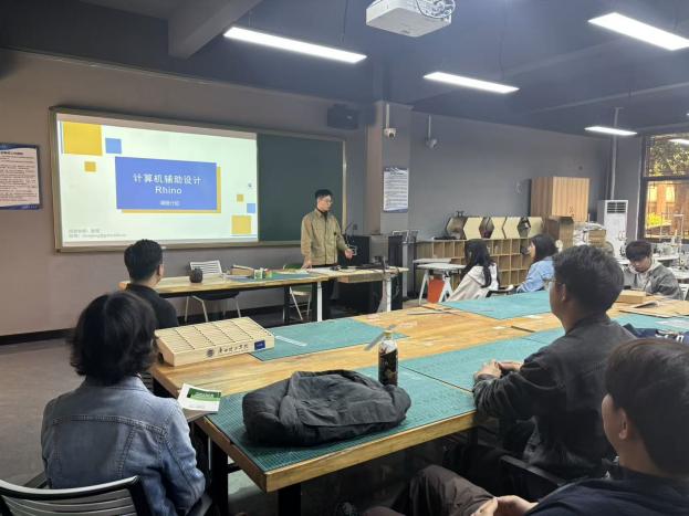 在磨课环节中,窦强老师带来了《计算机辅助设计Rhino》课程的展示。窦老师通过实际案例演示,生动展现了参数化建模的逻辑与技巧,强调软件教学与设计思维的融合,旨在帮助学生突破技术壁垒,高效表达设计创意。张洋老师的《时尚饰品设计》课程则充满时尚气息与市场洞察。她从文化溯源入手,结合当下流行趋势,详细阐述了从灵感提取到成品实现的全过程,引导学生在设计中平衡艺术审美与商业价值。陈咏妤老师的《综合材料艺术》课堂打破了传统材料的界限。通过丰富的图片与实物展示,她讲解了多种非传统材料在艺术创作中的肌理表现与情感表达,鼓励学生大胆实验,拓展设计语言的边界。刘湘洪老师在《设计材料与工艺》的磨课中,聚焦于“材料即语言”的教学理念。她系统梳理了各类新型材料特性及其在当代设计中的应用场景,强调理论与实践结合,夯实学生的设计落地能力。