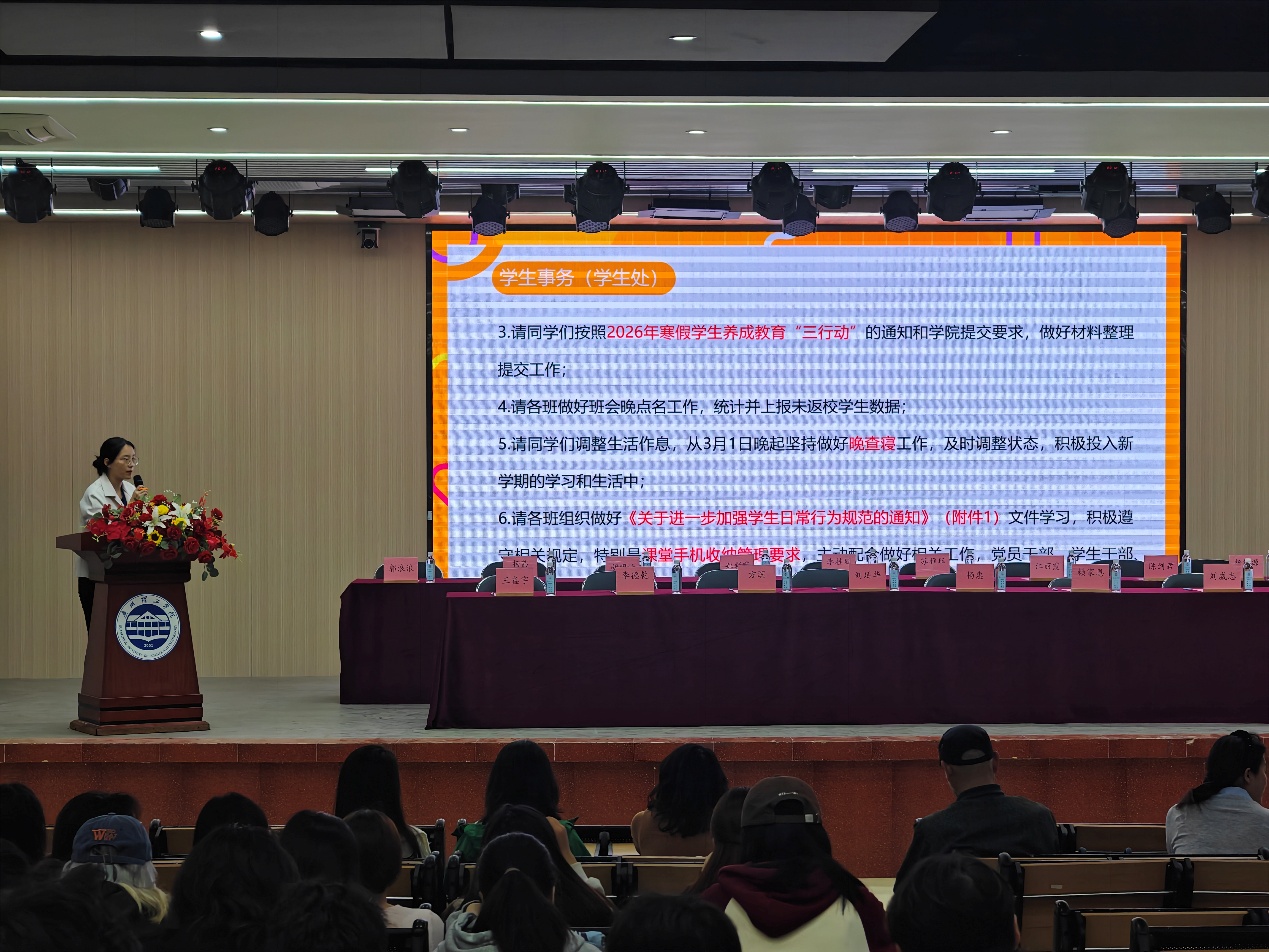 2026年3月1日,艺术设计学院在6栋2号报告厅召开预备周班会暨外出采风创作安全教育大会。学院党总支书记杨惠,教学副院长李瑞,视觉传达系主任段碧丽,写生带队教师代表及24级视觉传达设计专业学生参加会议,会议由辅导员江丽霞老师主持。