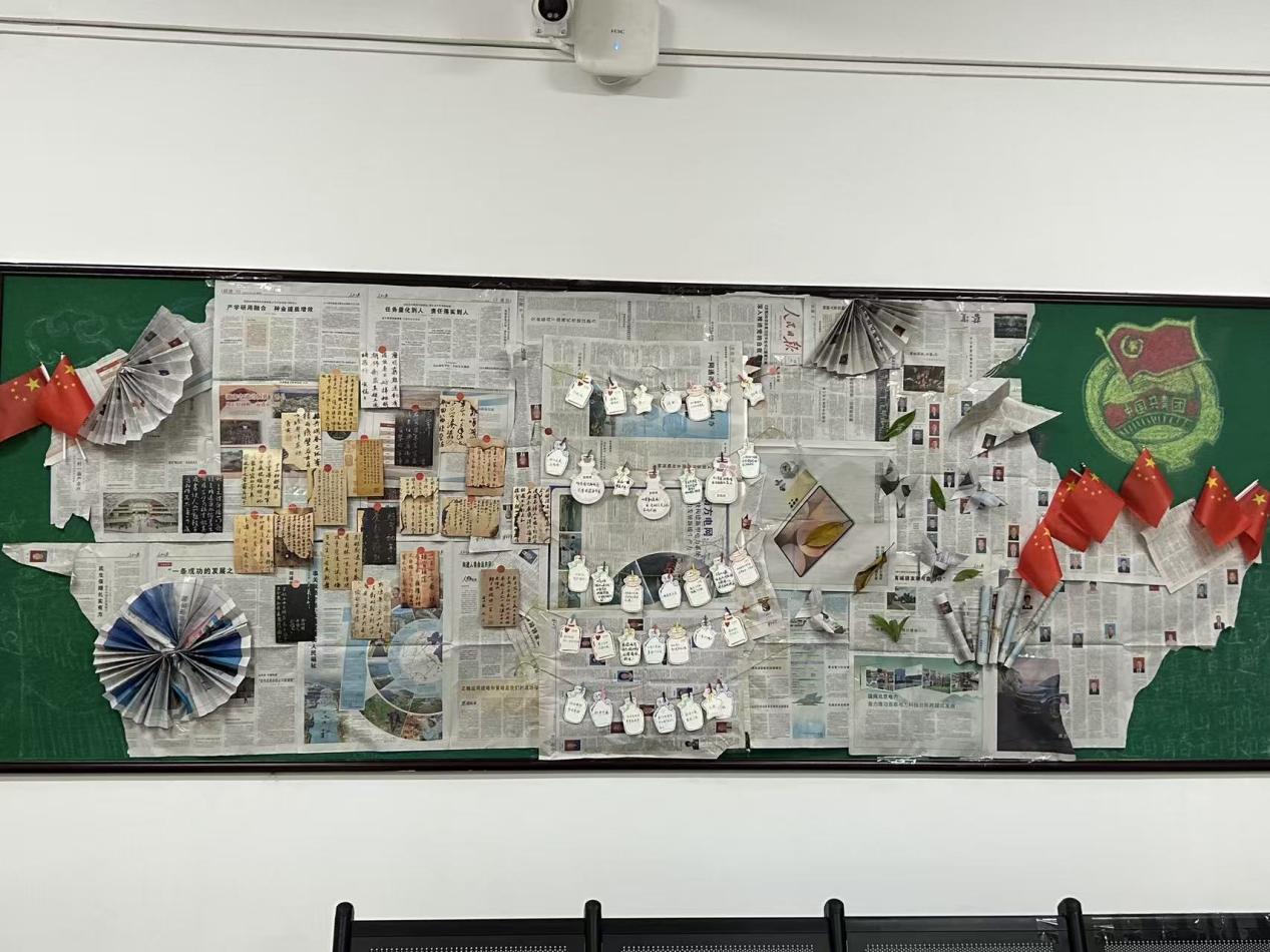 报纸纸蝶:旧报纸折成的蝴蝶错落分布,象征在知识中蜕变成长;四是落叶区,校园落叶点缀墙面,增添自然诗意。