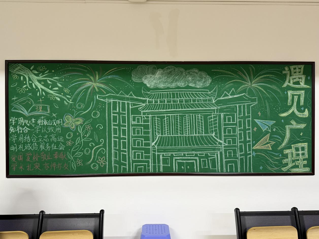画面主体为传统建筑风格的校园建筑,细致的线条勾勒出建筑的古朴与典雅,既体现学校对文化传承的重视,又彰显校园独特的建筑美学。左侧的文字板块,“学用心志,行知成明;知行合一,学以致用……” 是学校精神的凝练,传递出治学、修身、奉献的价值追求。花草、蝴蝶、树枝等元素则为画面增添了生机与活力,寓意广理学子在充满希望的校园中成长。右侧“遇见广理”的大字醒目有力,搭配纸飞机和烟花图案,纸飞机象征着学子们的梦想与志向,烟花寓意着在广理的遇见如烟花般绚烂且意义非凡,背景的云朵和星空元素营造出广阔的意境,体现广理学子胸怀天下的格局。