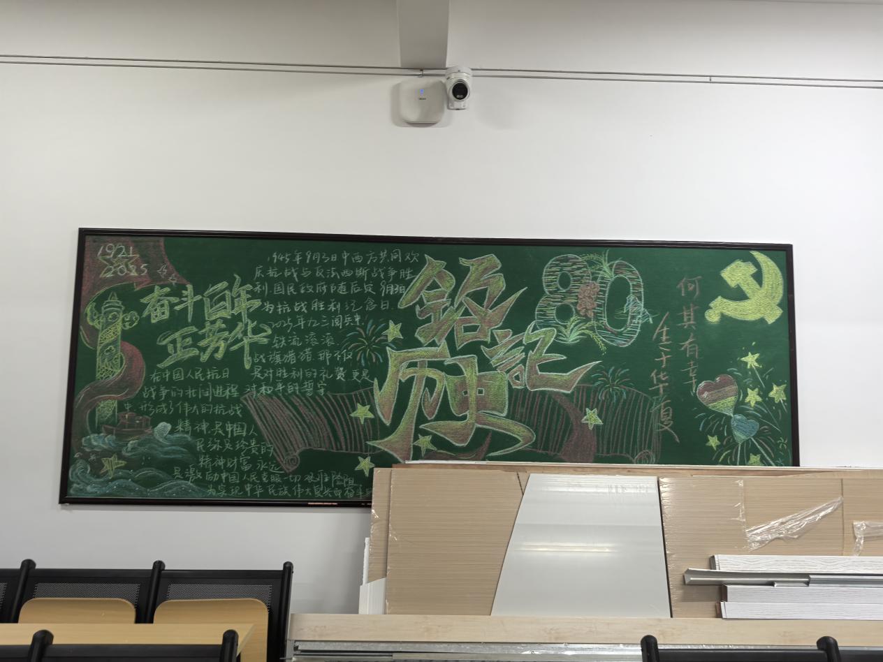 本次黑板报以“铭记历史,和平永驻”为核心主题,聚焦中国人民抗日战争胜利80周年这一重要节点,通过符号化设计与主题内容的融合,传递历史记忆与和平愿景。版面中心突出“铭记历史”标题,以视觉焦点强化核心主旨,直接点明纪念抗日战争胜利、传承历史记忆的核心目的。左侧的红船与华表柱形成呼应:红船象征中国共产党的诞生与初心,代表着抗战时期党对民族解放事业的引领;华表柱作为中华优秀传统文化与民族精神的象征,寓意抗战精神根植于深厚的民族底蕴,是中华民族不屈不挠的精神图腾。右侧党徽与书卷的组合,既凸显党在抗日战争中的中流砥柱作用,又以书卷象征对历史的记载与传承,呼应抗战胜利80周年的历史回顾,传递“以史为鉴”的理念。整体设计通过意象化符号的搭配,将历史记忆、党的引领与和平期盼融为一体,引导观者铭记抗战历程,珍惜当下和平,传承伟大抗战精神。