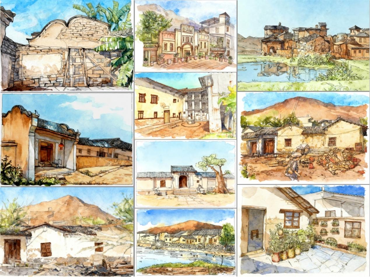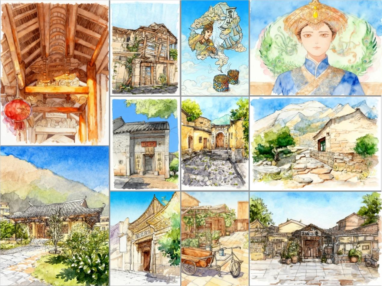 此次采风,同学们完成多篇传统线描作品,更以 “手绘 + AI” 模式产出融合地域文化的创意作品,既深化了对客家文化的理解,也锤炼了符号提取与转化技能。置身科技革命浪潮之中,年轻一代肩负着守护古村记忆、创新文化表达的使命,而此次采风,正是一次极具价值的成功探索。