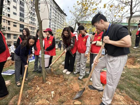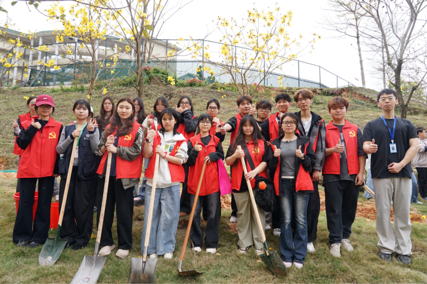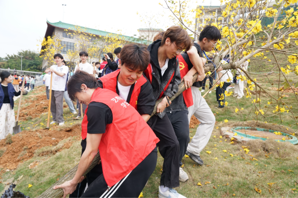 从搬运树苗到扶正固定,从培土压实到浇水养护,青年学子们以饱满的热情投入其中,充分展现了团结协作、吃苦耐劳的精神风貌。红马甲在黄风铃花的映衬下格外鲜艳,成为春日里一道温暖的风景线。