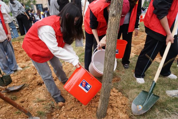 活动现场,大家热情高涨、干劲十足。在专业人员的指导下,师生们分工协作、默契配合:有的挥锹铲土,有的扶树正苗,有的提桶浇水,每一道工序都一丝不苟。大家合力将一棵棵带着生机的树苗植入坑中,用汗水浇灌希望,用双手守护绿意。