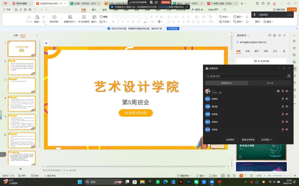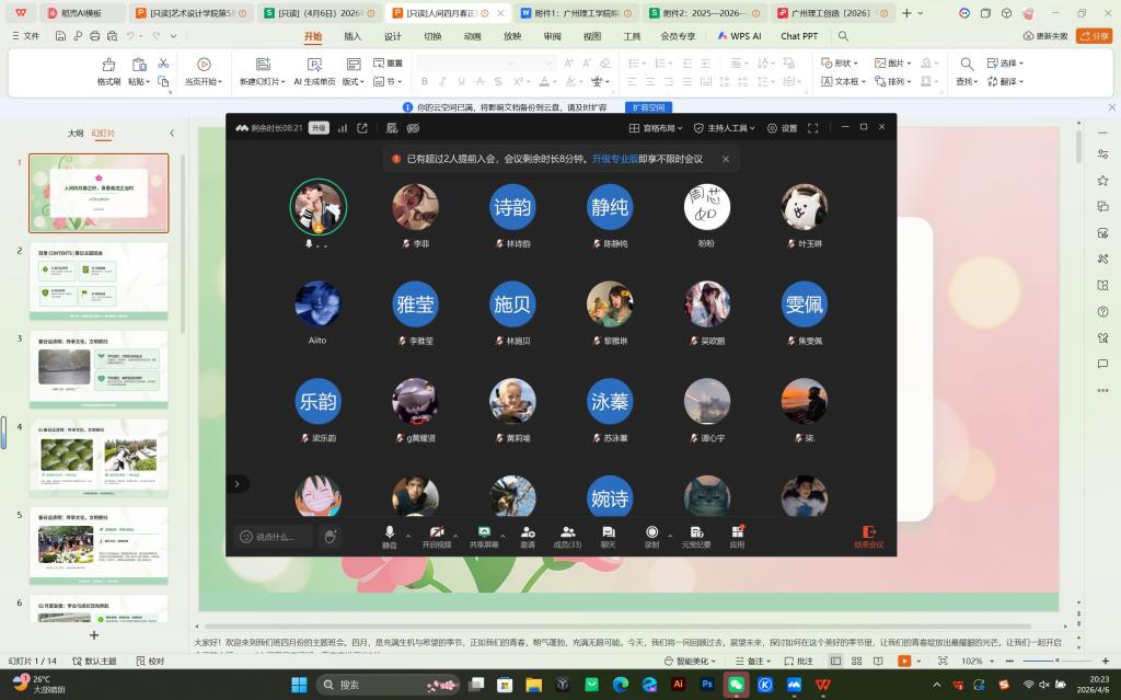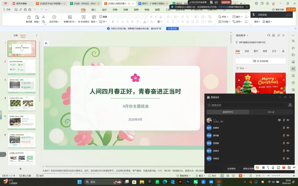 为引导青年学子传承清明文化、总结学业成果、强化安全意识、规划未来发展,2026年4月6日晚,艺术设计学院以“人间四月春正好,青春奋进正当时”为主题召开线上班会,全体学生共同参与,旨在激励同学们珍惜时光、奋发向上,同时落实假期安全与成长规划指导。