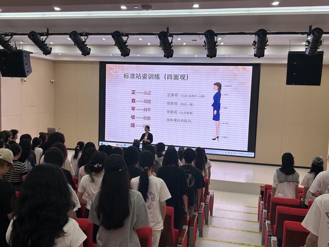 理论讲解结束后,进入实操演练环节,这也是本次培训的重点环节。老师围绕站姿、走姿、手势等基础仪态,进行现场示范,逐一拆解动作要领,强调“站如松、坐如钟、行如风”的体态要求,以及眼神交流、表情管理的细节技巧。为确保培训效果,老师邀请学生上台参与现场演示,针对学生在实操中出现的体态不标准、手势不规范等问题,进行即时纠偏与针对性指导,耐心纠正每一个细节偏差。
